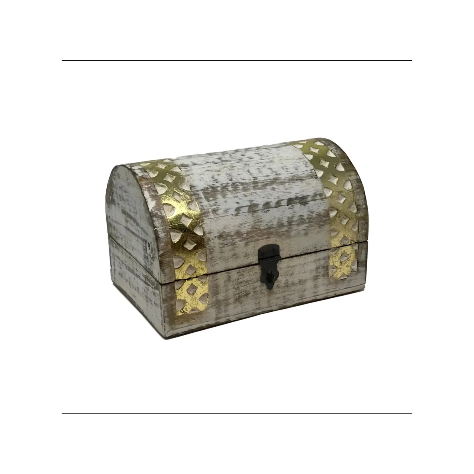 The chest is made from high-quality mango wood a durable and sustainable material that ensures longevity and beauty. The whitewashed finish provides a rustic and charming appearance while the gold foil detailing adds a touch of opulence and glamour.