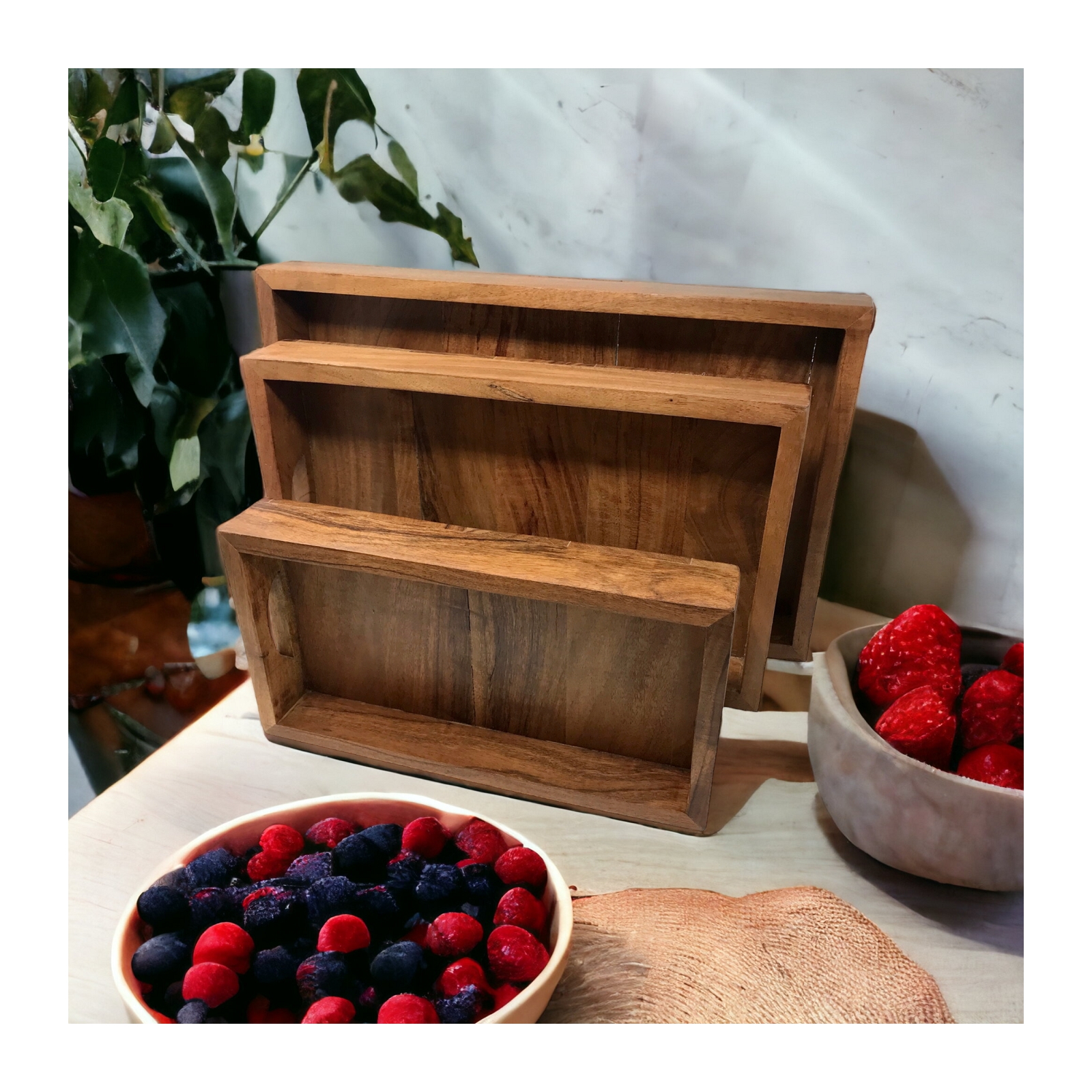 This set of three serving/charcuterie trays is the perfect addition to any home. Crafted from Acacia Wood these solid wood trays are food-safe sturdy and designed to last. The large tray measures 20 x 12 x 2 high while the other two trays nest inside for easy storage when not in use.